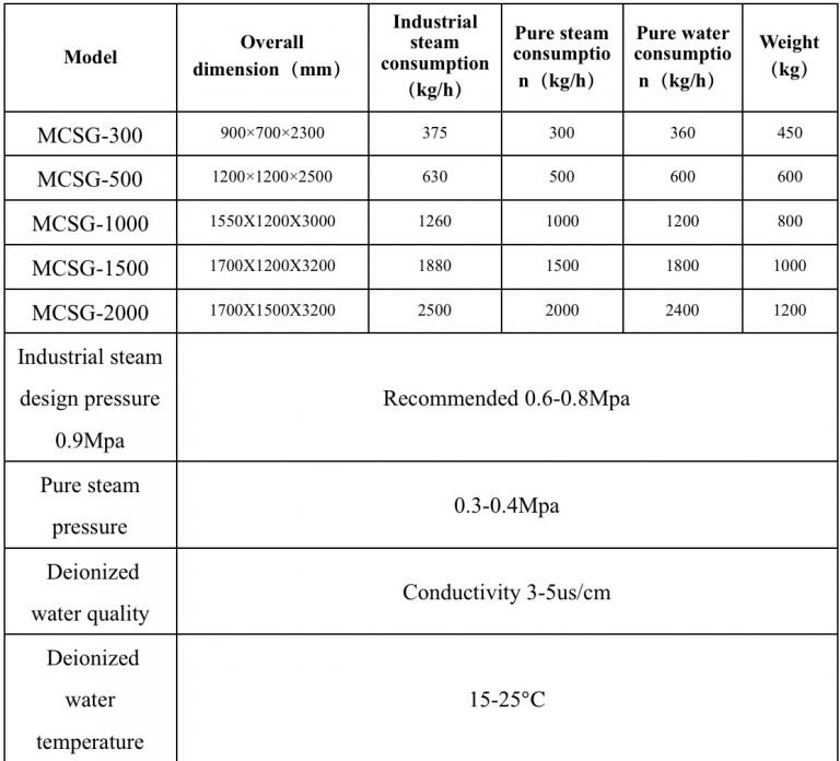 - Pure steam: The raw water is double osmosed water. The steam is produced by polished boiler which is made of 316L stainless steel. Stainless steel piping, fittings, and components are also made of 316L stainless steel. It have two heating modes. One is electrical heating and the other one is industrial steam heating.